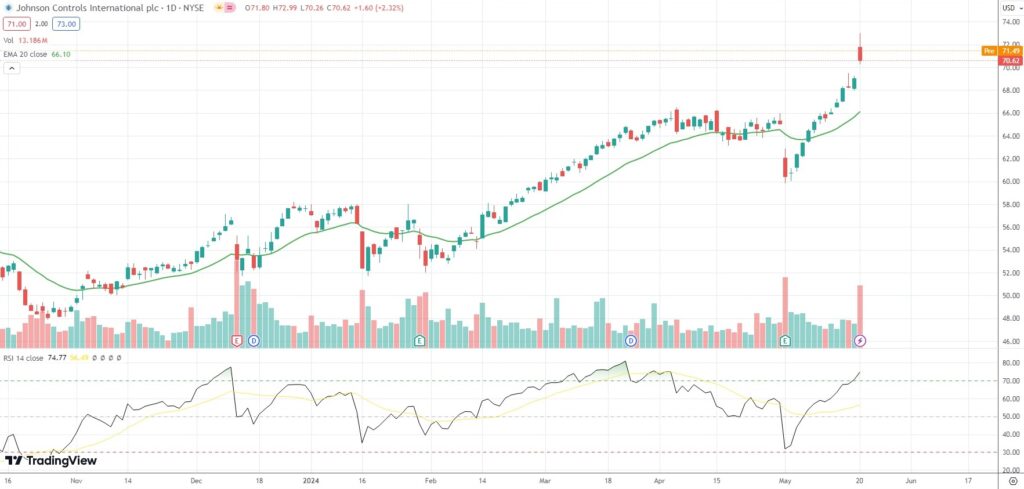 The shares of Johnson Controls International PLC (JCI) closed 2.32% ($1.60) higher at $70.62 in New York on Monday, as they extended the gains from the previous five market sessions.