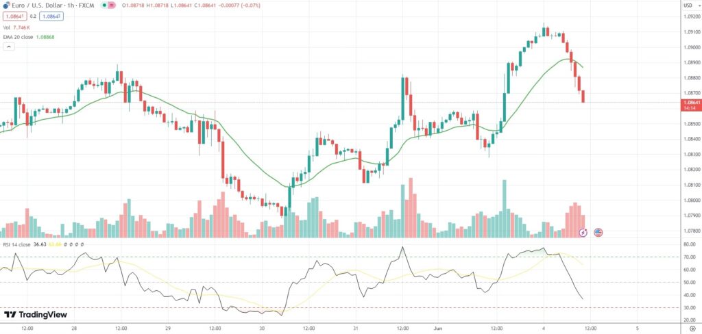 The Euro was 0.36% weaker on the day against the US Dollar, with the EUR/USD currency pair last trading at 1.0865 ahead of US job openings data for April, due out later on Tuesday.