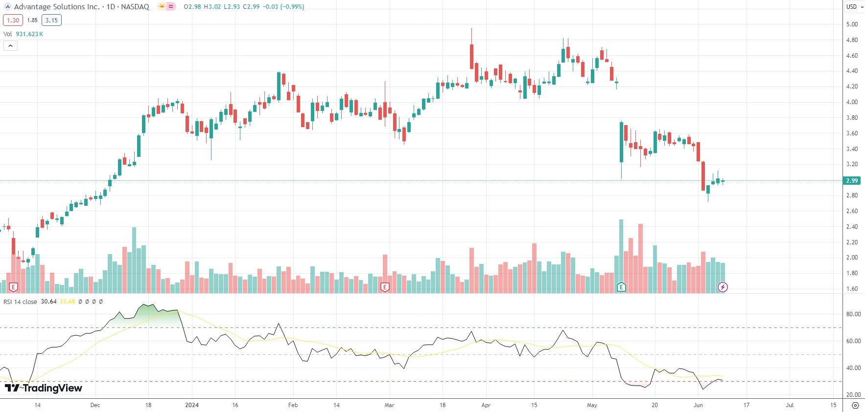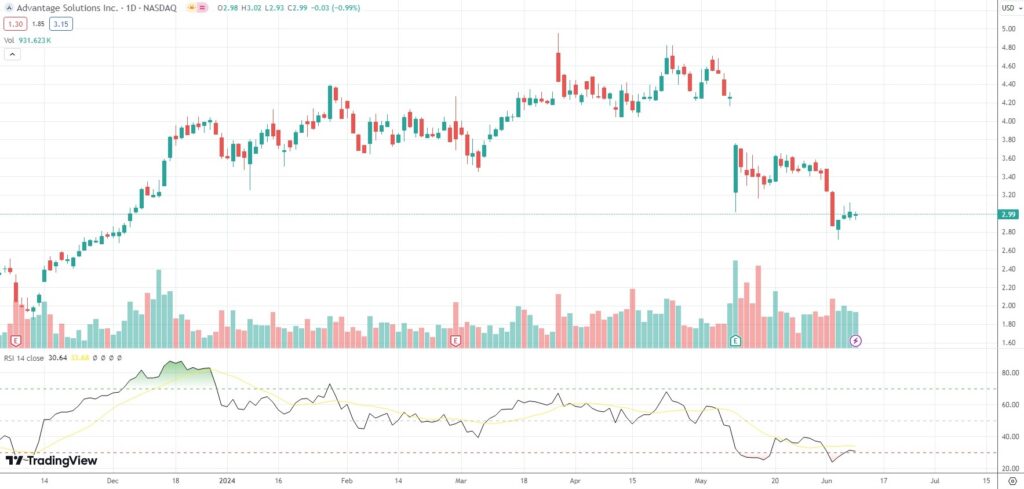 The shares of Advantage Solutions Inc (ADV) closed 0.99% ($0.03) lower at $2.99 on Nasdaq on Monday, as they snapped a three-day streak of gains.