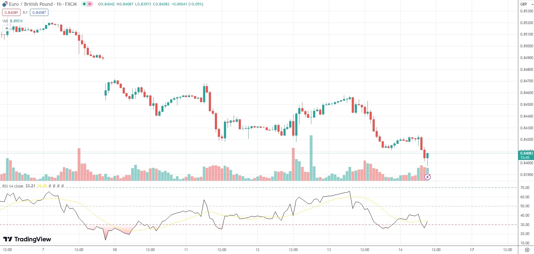 The Euro was little changed on the day against the British Pound, with the EUR/GBP currency pair last trading at 0.8408.