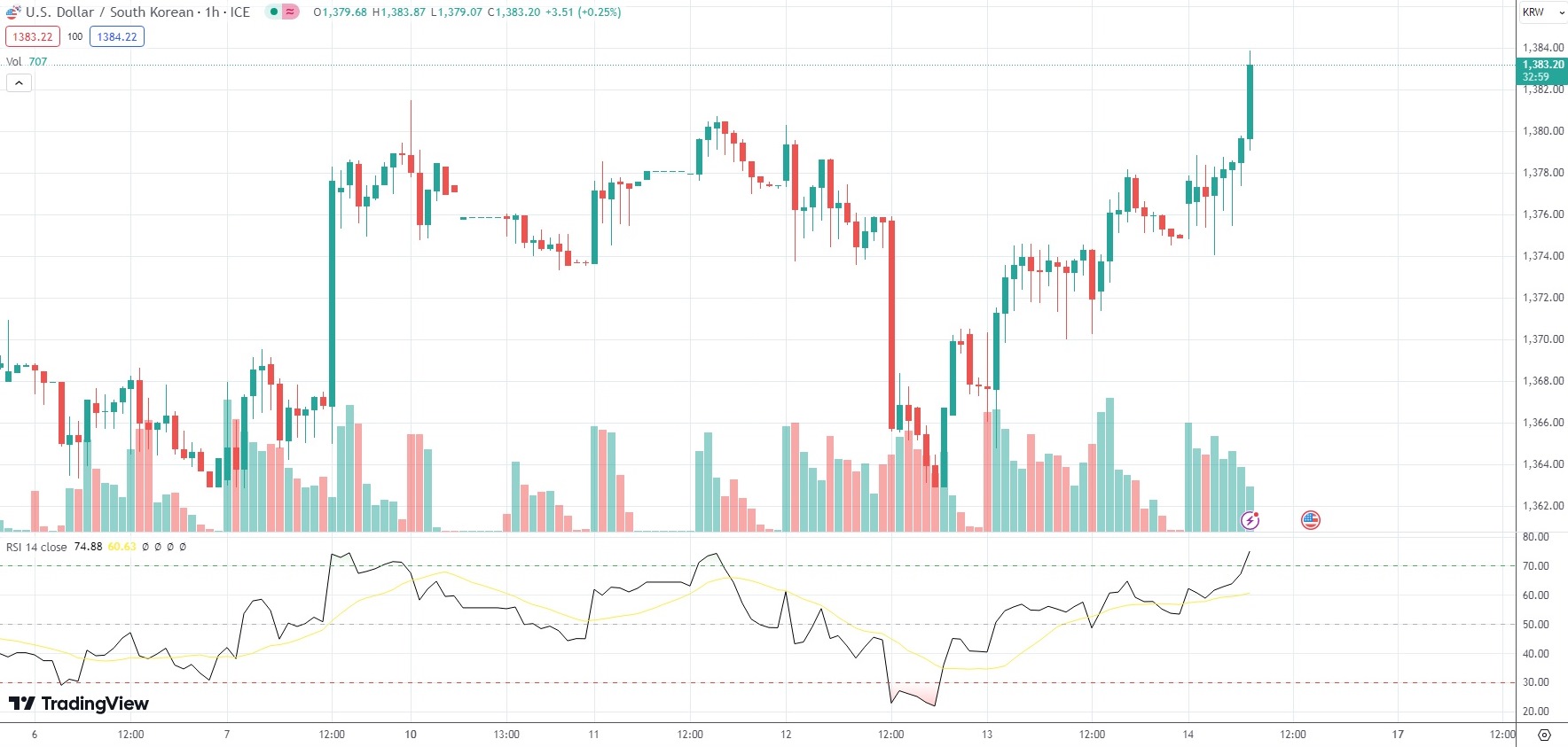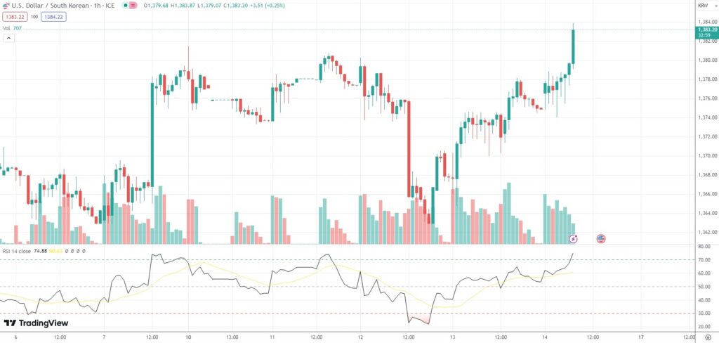 The South Korean Won was 0.59% weaker on the day against the US Dollar, with the USD/KRW currency pair last trading at 1,383.04.