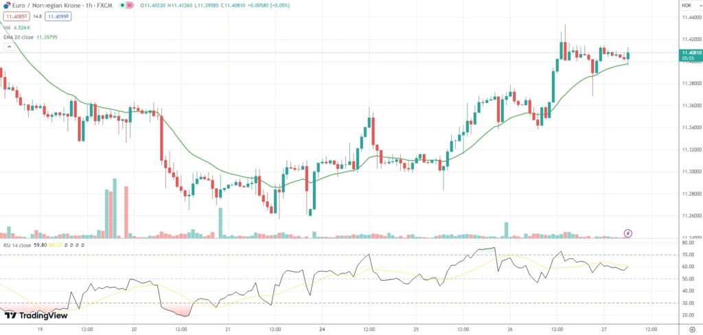 The Norwegian Krone was last little changed on the day against the Euro, with the EUR/NOK currency pair trading at 11.4083.