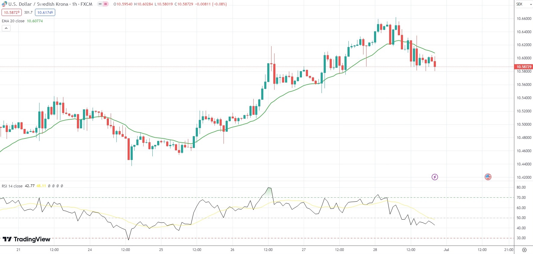 The USD/SEK currency pair settled 0.30% lower at 10.5873 on Friday. For the week, the exotic currency pair went up 0.89%.
