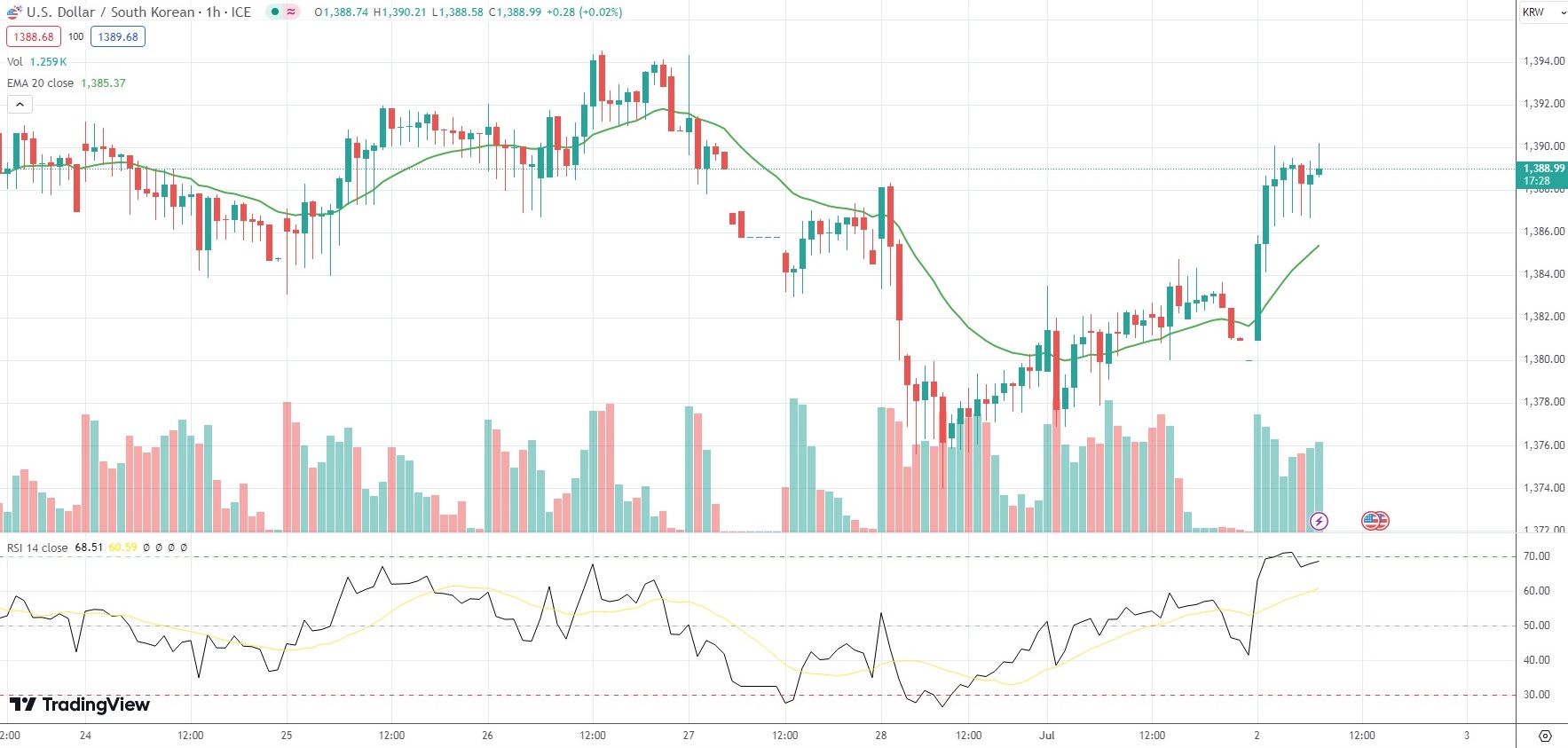 The South Korean Won was 0.56% weaker on the day against the US Dollar, with the USD/KRW currency pair last trading at 1,388.87.