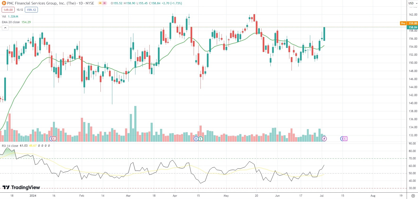 The shares of The PNC Financial Services Group Inc (PNC) closed 1.73% ($2.70) higher at $158.84 in New York on Tuesday, as they extended the gains from the previous three market sessions.