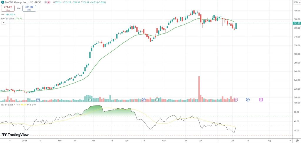 The shares of EMCOR Group Inc (EME) closed 3.99% ($14.23) higher at $371.09 in New York on Wednesday, as they snapped a three-day streak of losses.