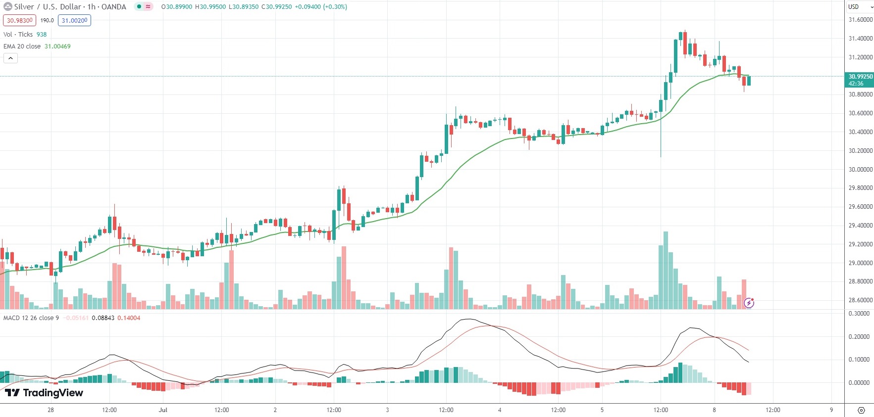 As of 7:16 GMT on Monday Spot Silver was losing 0.74% to trade at $30.994 per troy ounce.