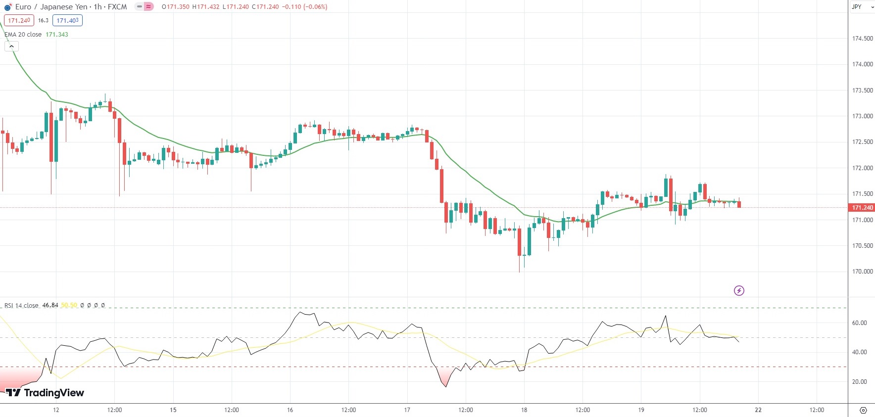 The EUR/JPY currency pair settled 0.14% lower at 171.240 on Friday. For the week, the minor currency pair went down 0.54%, as it extended the loss from the prior weekly period.