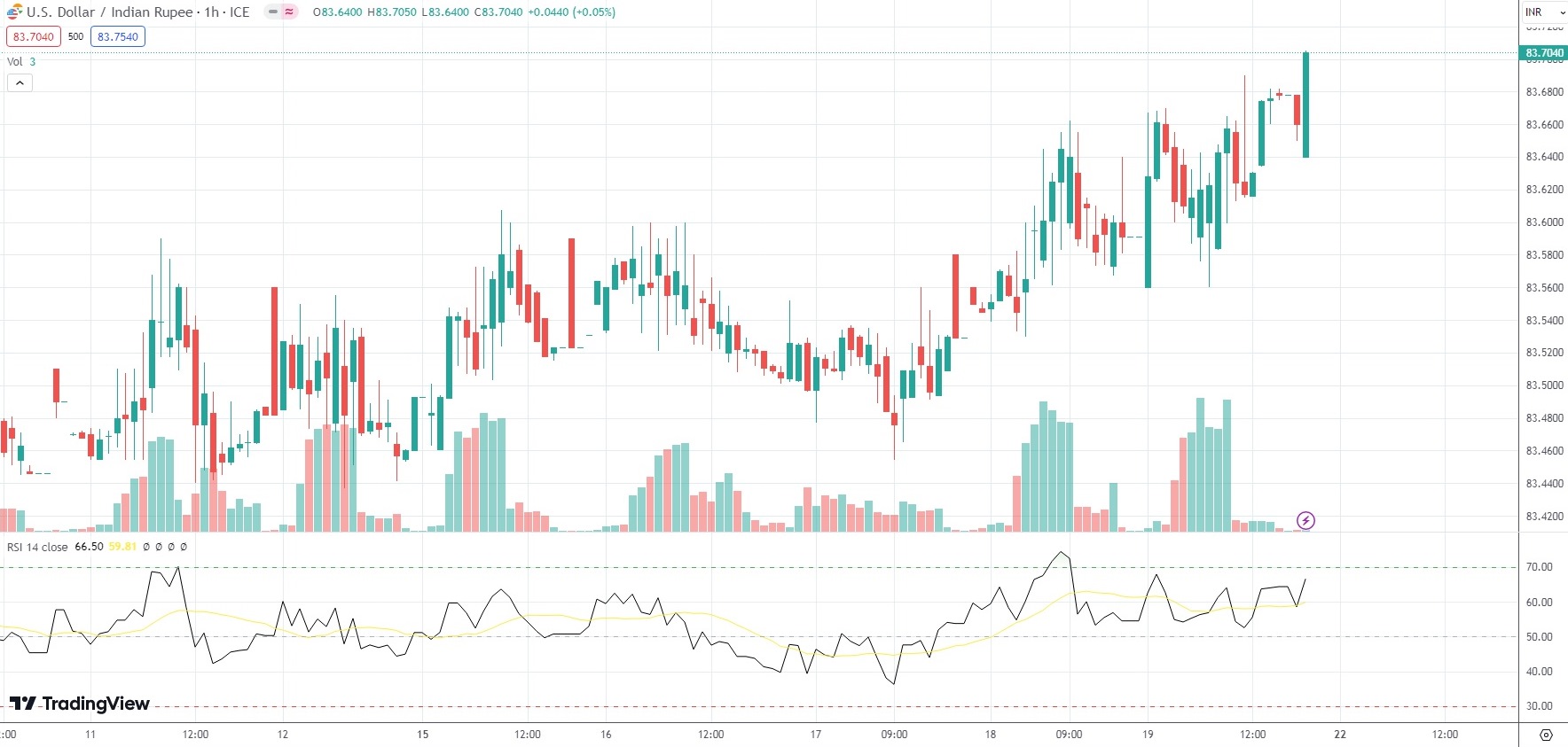 The USD/INR currency pair settled 0.14% higher at 83.7040 on Friday. For the week, the exotic currency pair went up 0.25%.
