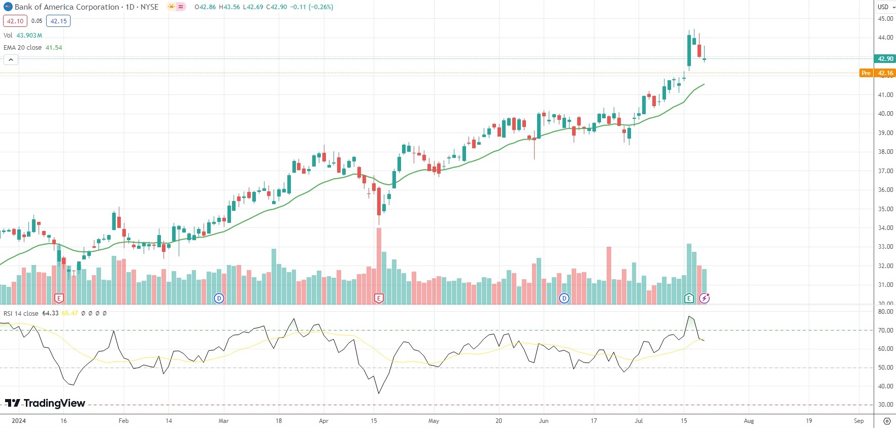 The shares of Bank of America Corp (BAC) closed 0.26% ($0.11) lower at $42.90 in New York on Friday, as they extended the losses from the previous two market sessions.