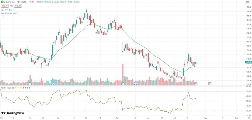 The shares of Atkore Inc (ATKR) closed 0.30% ($0.43) higher at $145.00 in New York on Tuesday, as they extended the gain from the previous market session.