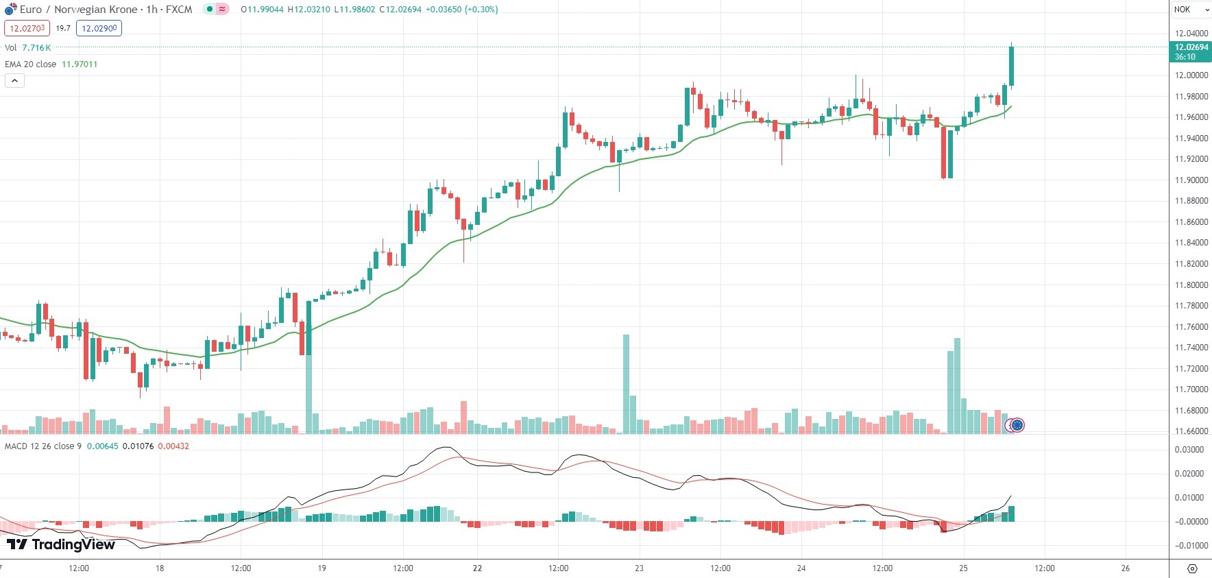 The Norwegian Krone was last 0.67% weaker on the day against the Euro, with the EUR/NOK currency pair trading at 12.0292.