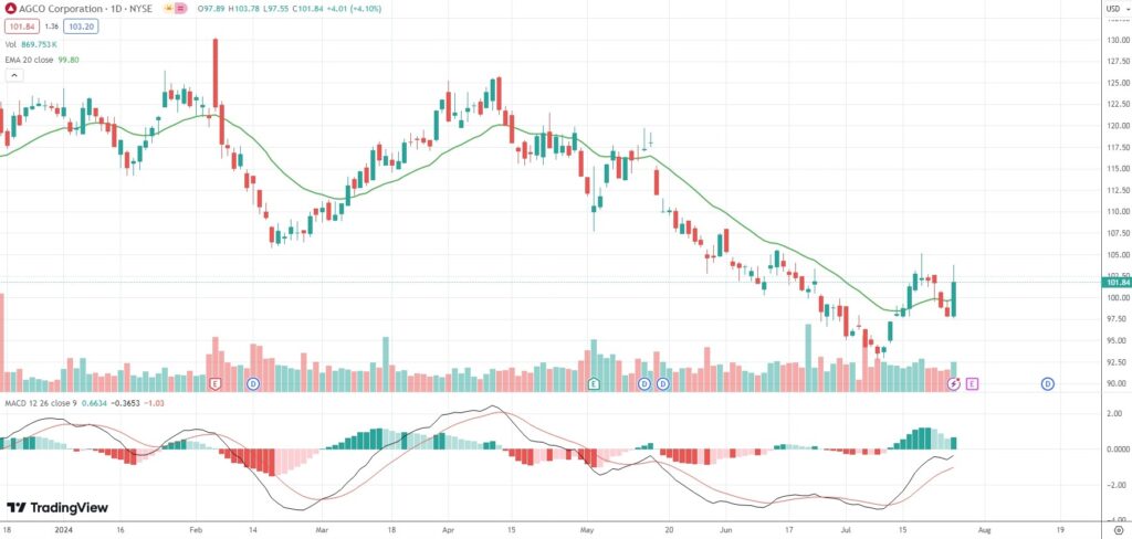 The shares of AGCO Corporation (AGCO) closed 4.10% ($4.01) higher at $101.84 in New York on Thursday, as they snapped a five-day streak of losses.