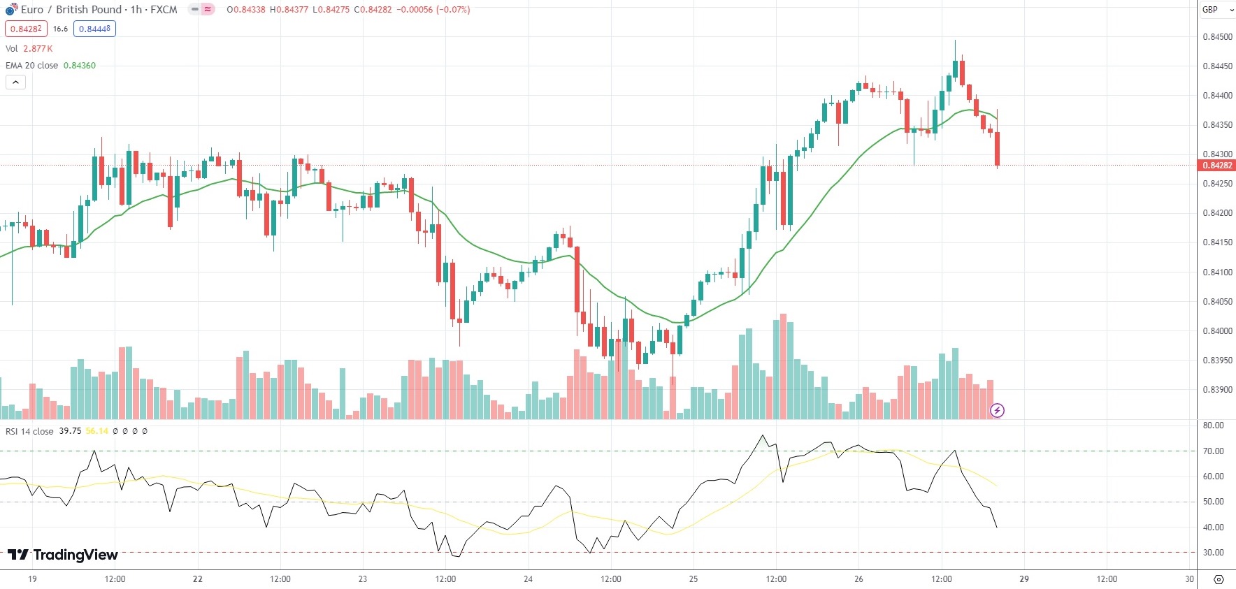 The EUR/GBP currency pair settled 0.13% lower at 0.8428 on Friday. For the week, the minor currency pair edged up 0.12%.