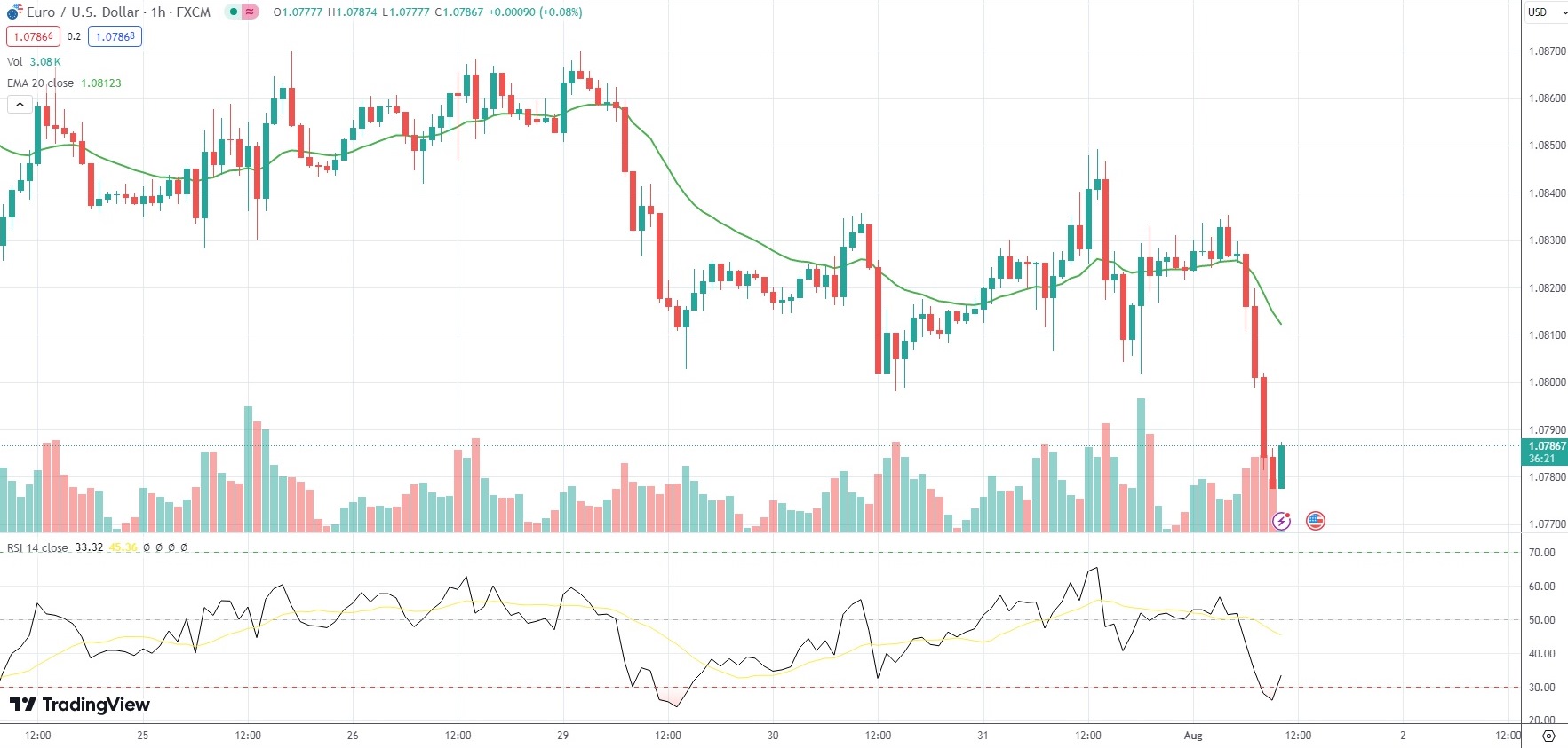 The Euro was last 0.36% weaker on the day against the US Dollar, with the EUR/USD currency pair trading at 1.0787.
