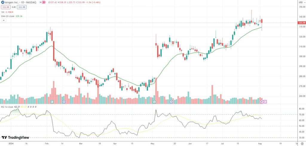 The shares of Amgen Inc (AMGN) closed 0.46% ($1.54) lower at $333.99 on Nasdaq on Friday, as they reversed a gain from the previous market session.