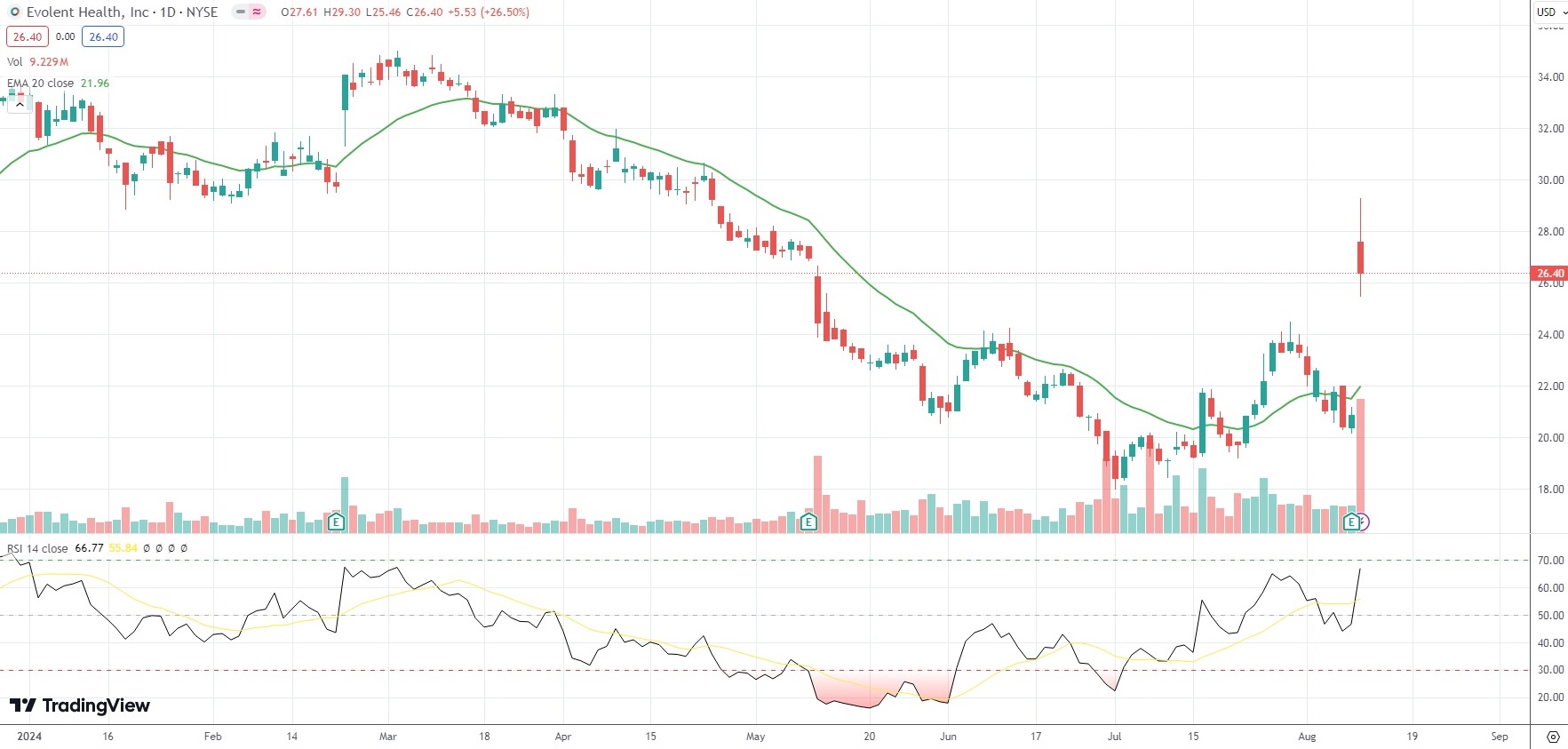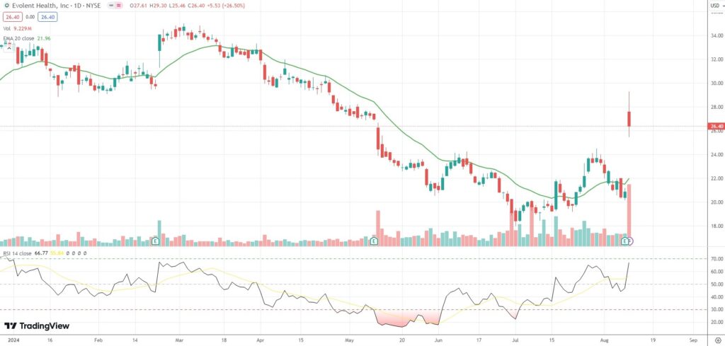 The shares of Evolent Health Inc (EVH) closed 26.50% ($5.53) higher at $26.40 in New York on Friday, as they extended the gain from the previous market session.