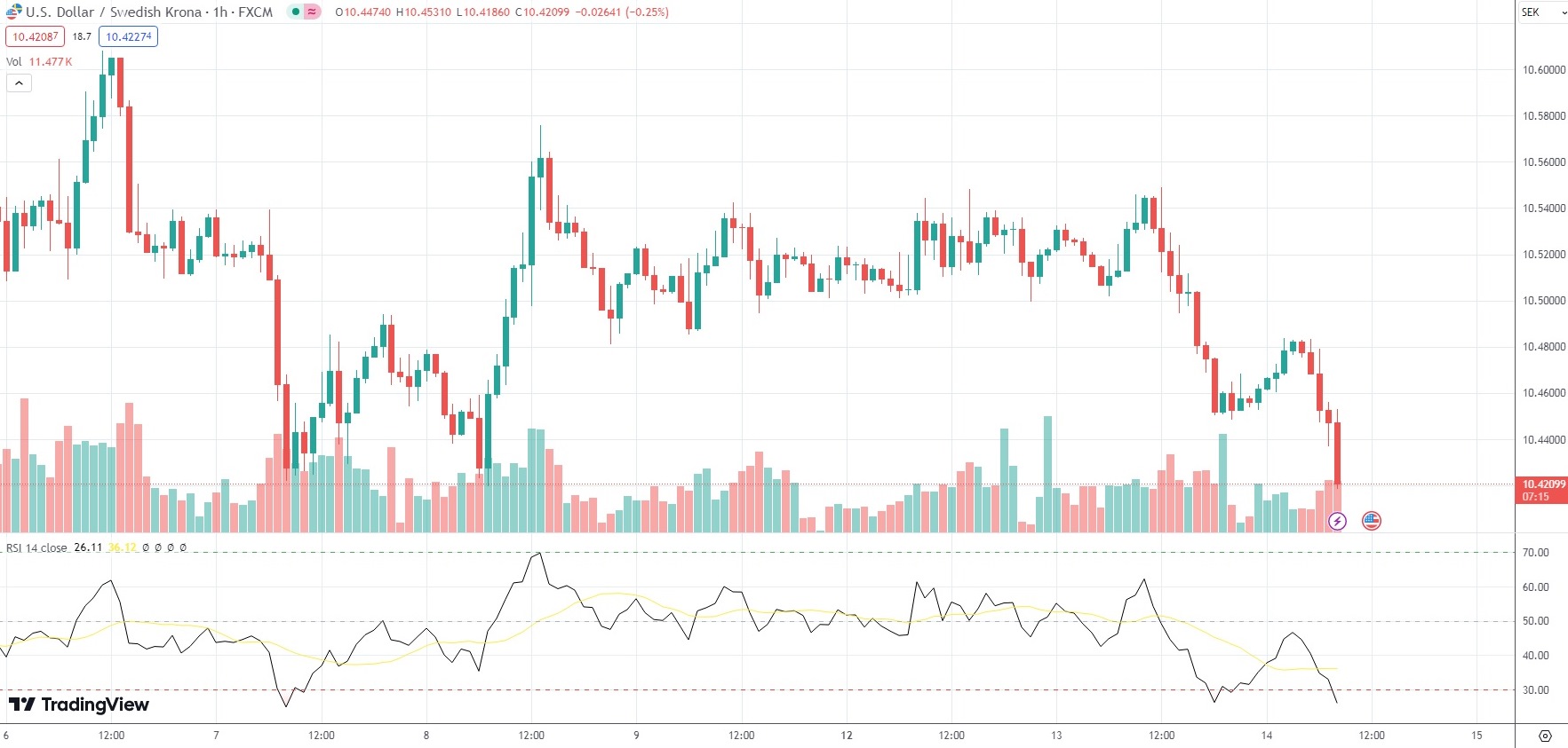 The Swedish Krona was 0.30% firmer on the day against the US Dollar, with the USD/SEK currency pair last trading at 10.4212.