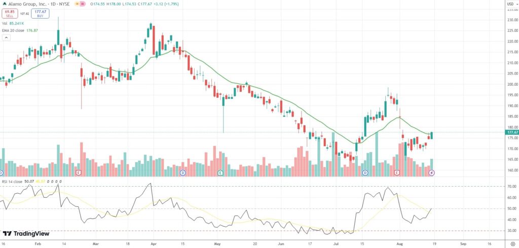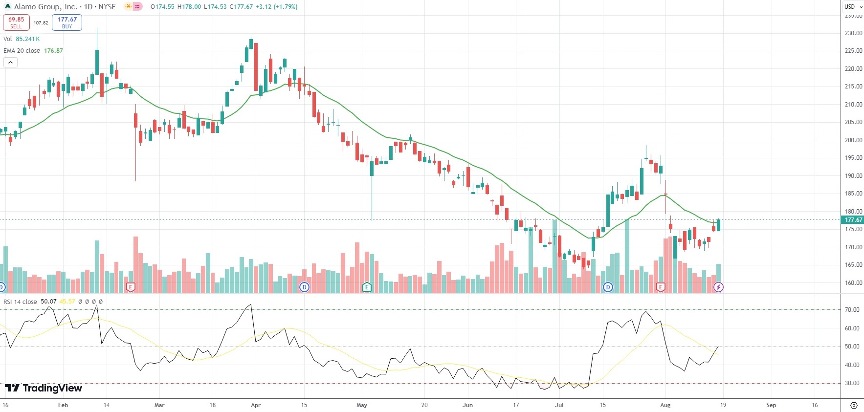 The shares of Alamo Group Inc (ALG) closed 1.79% ($3.12) higher at $177.67 in New York on Friday, as they extended the gain from the previous market session.
