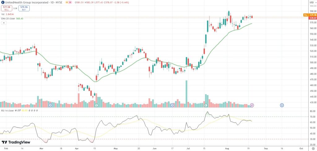 The shares of UnitedHealth Group (UNH) closed 0.44% ($2.58) lower at $578.07 in New York on Wednesday, as they snapped a two-day streak of gains.