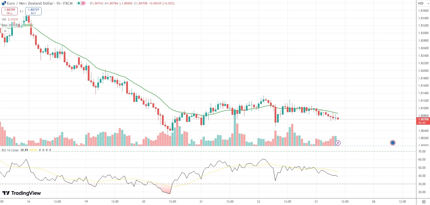 The New Zealand Dollar was 0.11% firmer on the day against the Euro, with the EUR/NZD currency pair last trading at 1.8073.