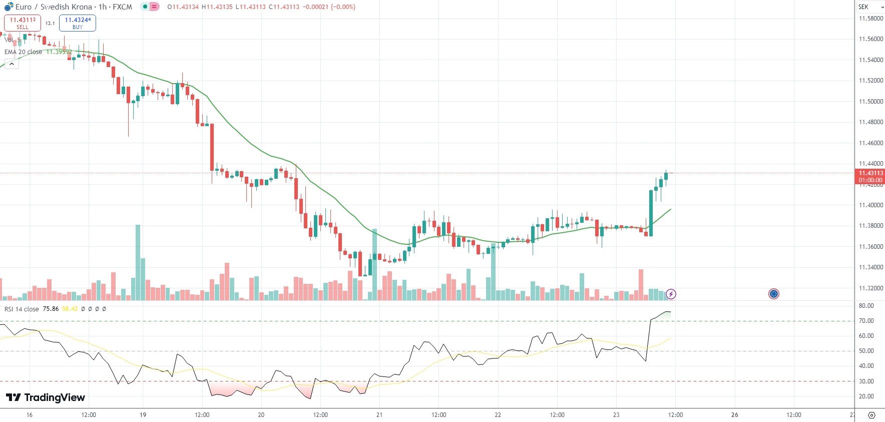 The Swedish Krona was 0.54% weaker on the day against the Euro, with the EUR/SEK currency pair last trading at 11.4314.