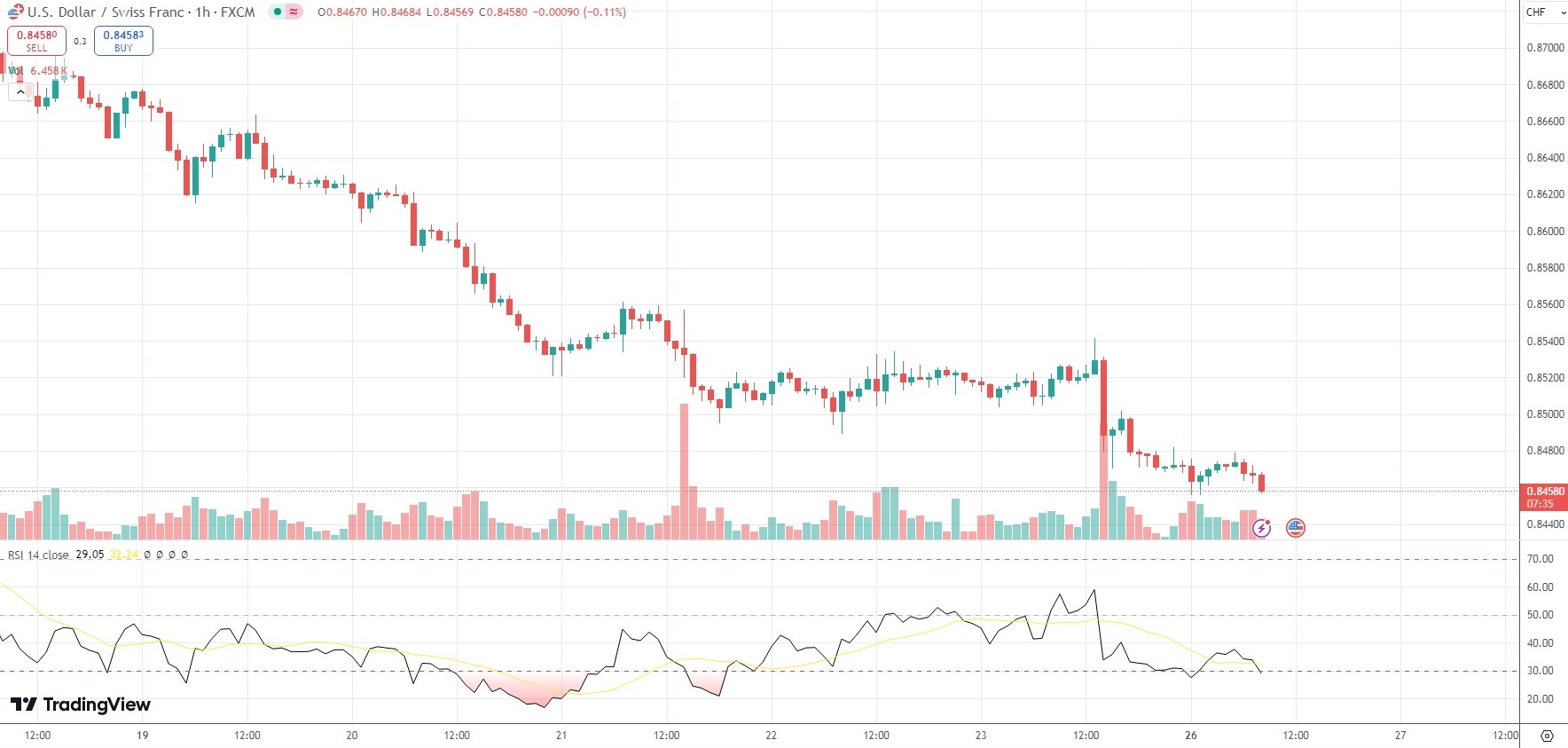 The USD/CHF currency pair plunged to a fresh three-week low of 0.8456 on Monday, after Federal Reserve Chair Jerome Powell solidified market expectations of a rate cut in September.