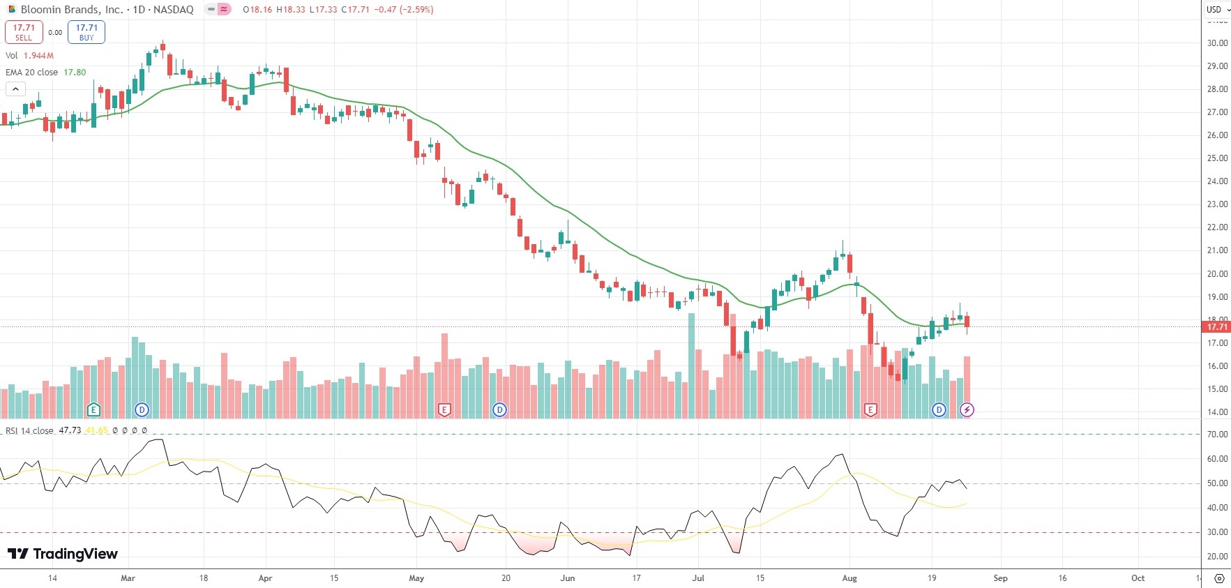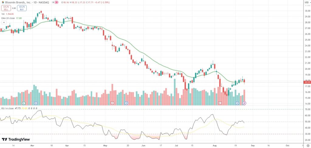 The shares of Bloomin’ Brands Inc (BLMN) closed 2.59% ($0.47) lower at $17.71 on Nasdaq on Monday, as they reversed a gain from the previous market session.