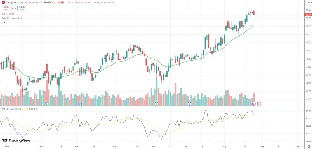 The shares of Campbell Soup Company (CPB) closed 0.71% ($0.36) lower at $50.44 on Nasdaq on Monday, as they snapped a six-day streak of gains.