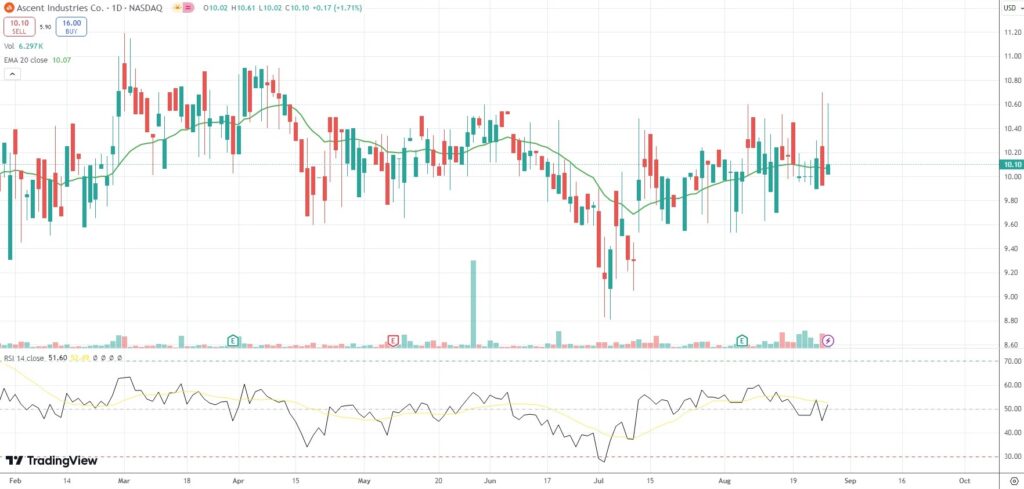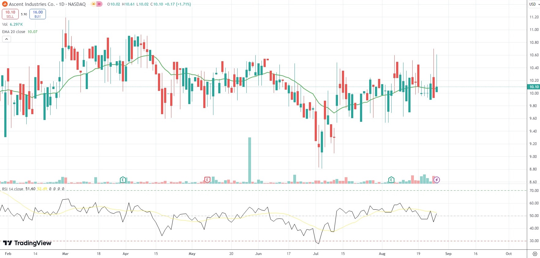 The shares of Ascent Industries Co (ACNT) closed 1.71% ($0.17) higher at $10.10 on Nasdaq on Tuesday, as they reversed a loss from the previous market session.