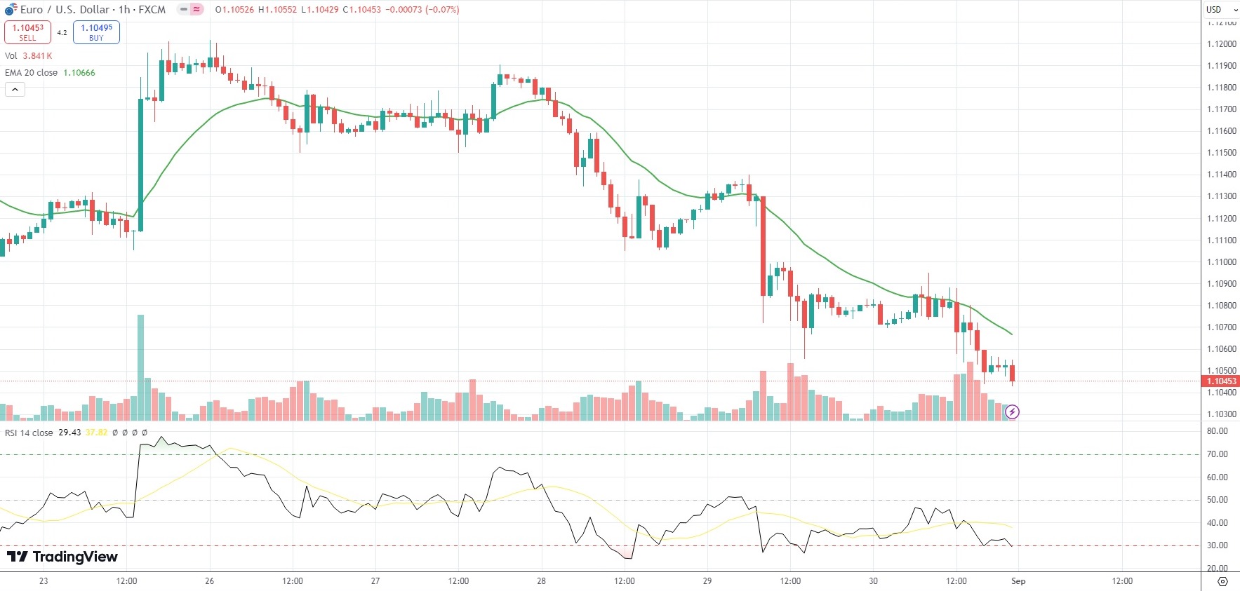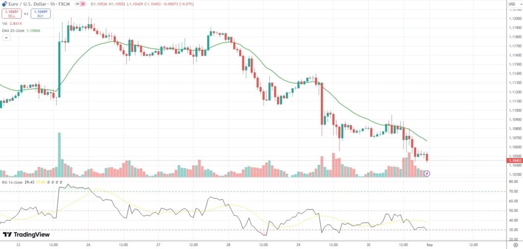 The EUR/USD currency pair settled 0.29% lower at 1.1045 on Friday, while extending the losses from the prior two trading days.