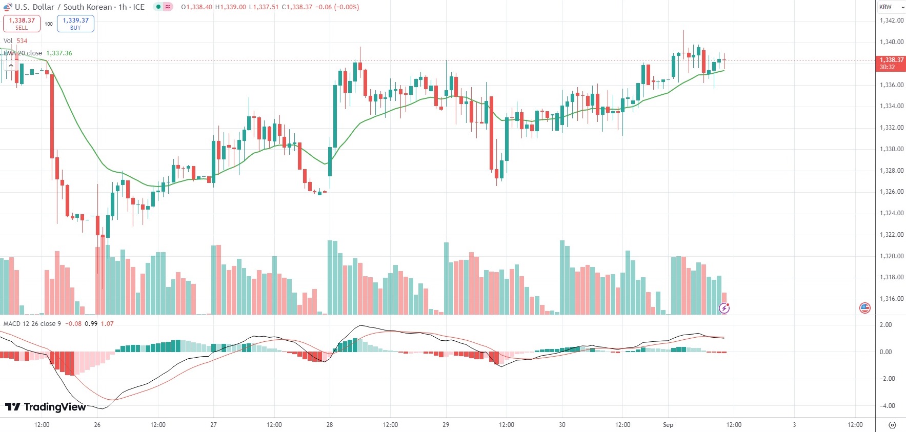As of 10:29 GMT on Monday the USD/KRW currency pair was edging up 0.14% to trade at 1,338.37.