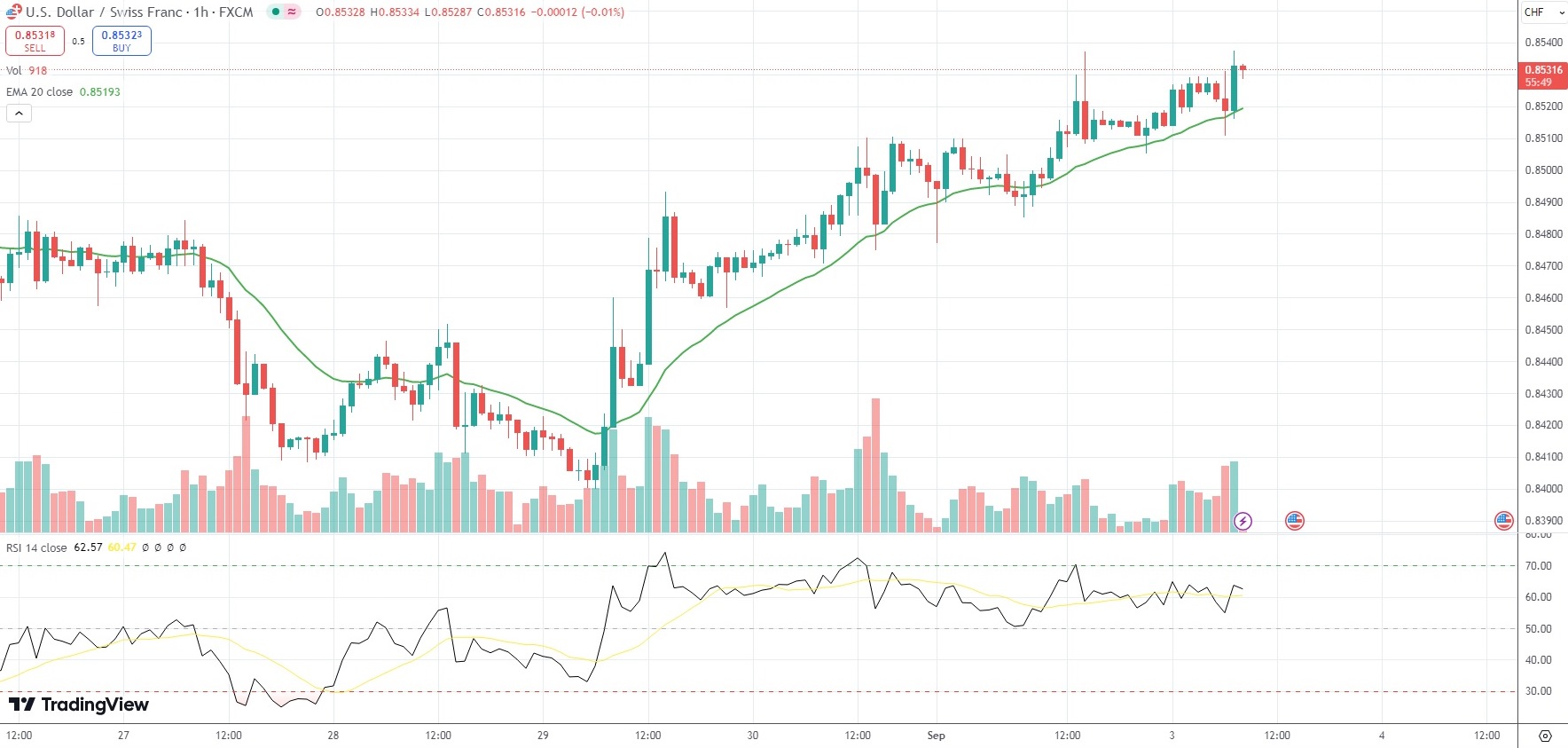 The USD/CHF currency pair held in proximity to a fresh one-week high of 0.8537 on Tuesday, after data revealed the Swiss economy had registered the fastest quarterly expansion since the second quarter of 2022, while annual CPI inflation had eased to its lowest level since March in August.