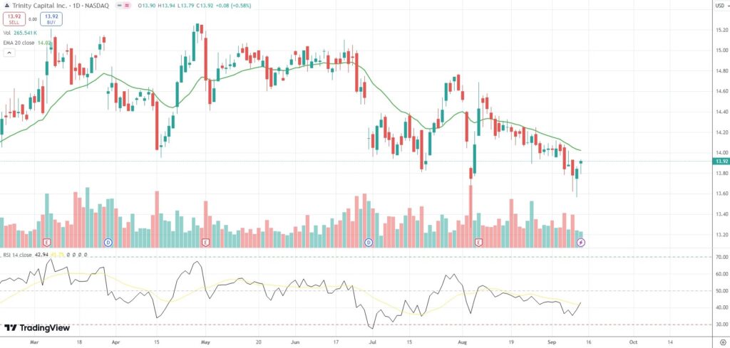 The shares of Trinity Capital Inc (TRIN) closed 0.58% ($0.08) higher at $13.92 on Nasdaq on Thursday, as they extended the gain from the previous market session.