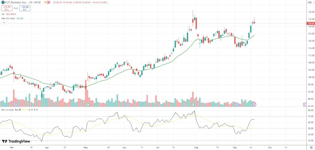 The shares of PJT Partners Inc (PJT) closed 0.34% ($0.44) lower at $129.67 in New York on Wednesday, as they snapped a four-day streak of gains.