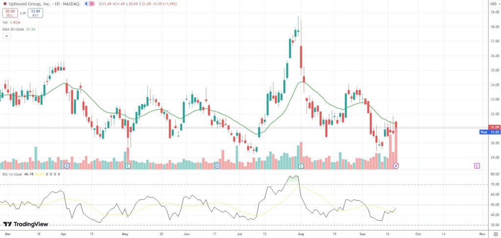 The shares of Upbound Group Inc (UPBD) closed 1.29% ($0.39) higher at $31.09 on Nasdaq on Thursday, as they reversed a small loss from the previous market session.