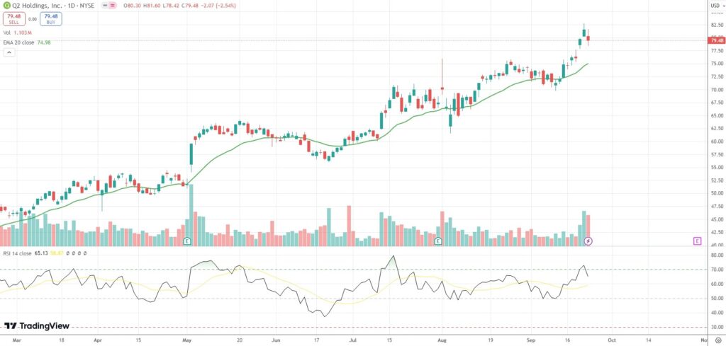 The shares of Q2 Holdings Inc (QTWO) closed 2.54% ($2.07) lower at $79.48 in New York on Monday, as they snapped a two-day streak of gains.