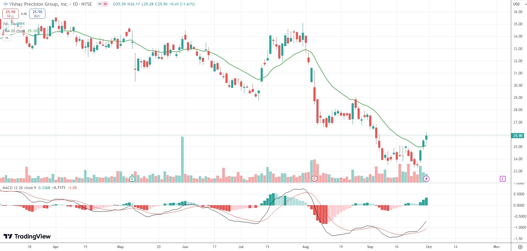 The shares of Vishay Precision Group Inc (VPG) closed 1.61% ($0.41) higher at $25.90 in New York on Monday, as they extended the gains from the previous two market sessions.