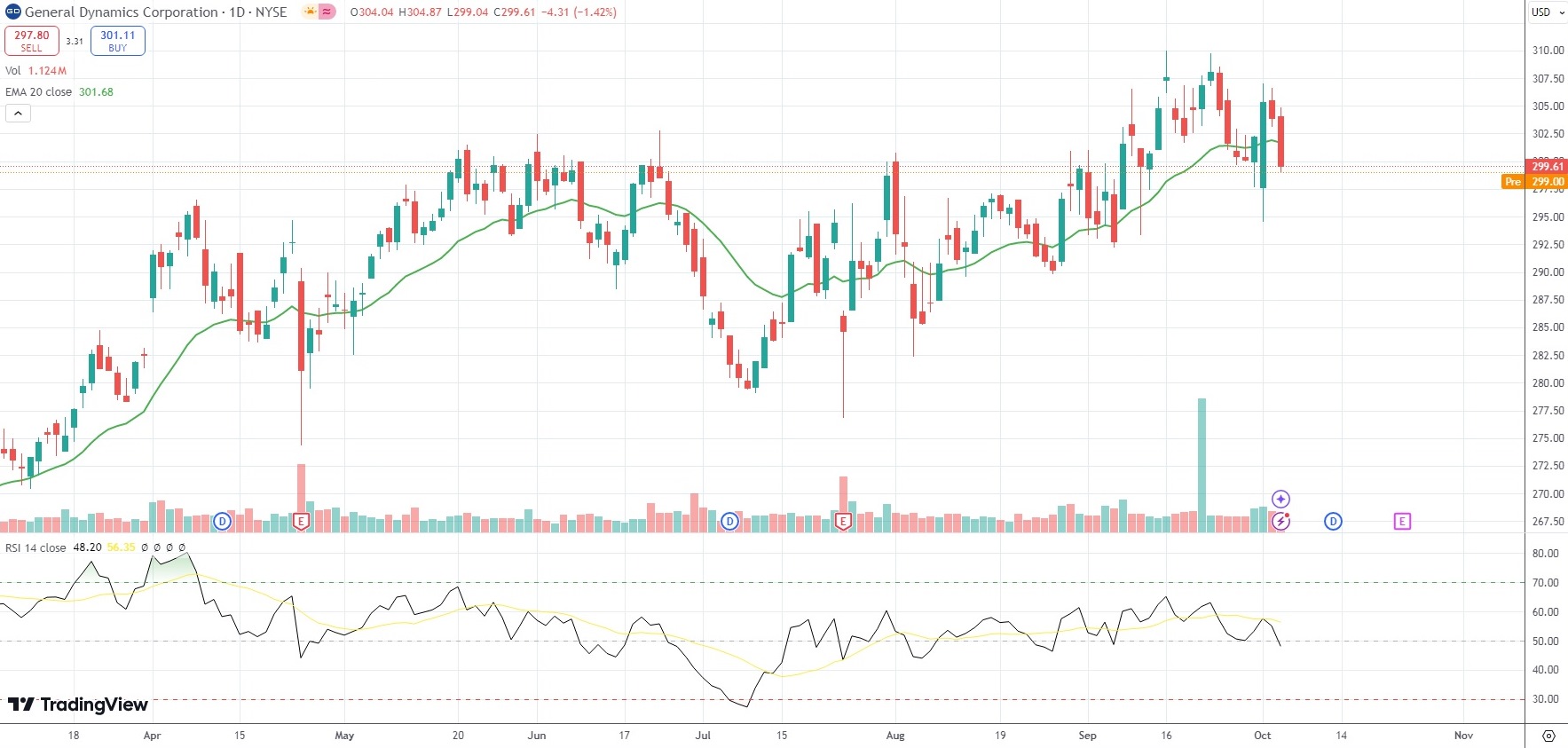 The shares of General Dynamics Corporation (GD) closed 1.42% ($4.31) lower at $299.61 in New York on Thursday, as they extended the loss from the previous market session.