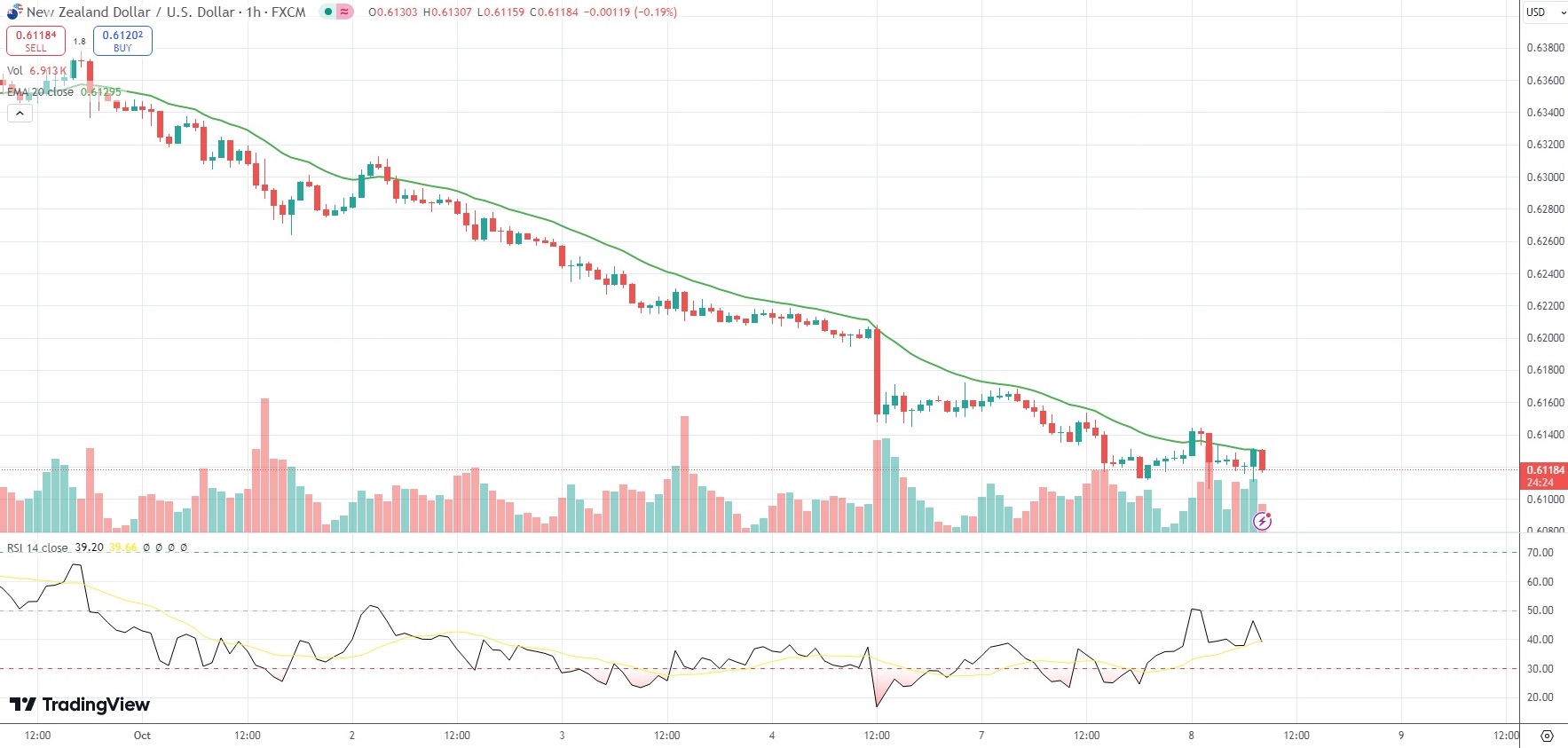 The NZD/USD currency pair hovered just above a fresh one-month low of 0.6106 on Tuesday ahead of the outcome of the RBNZ’s policy meeting on October 9th.