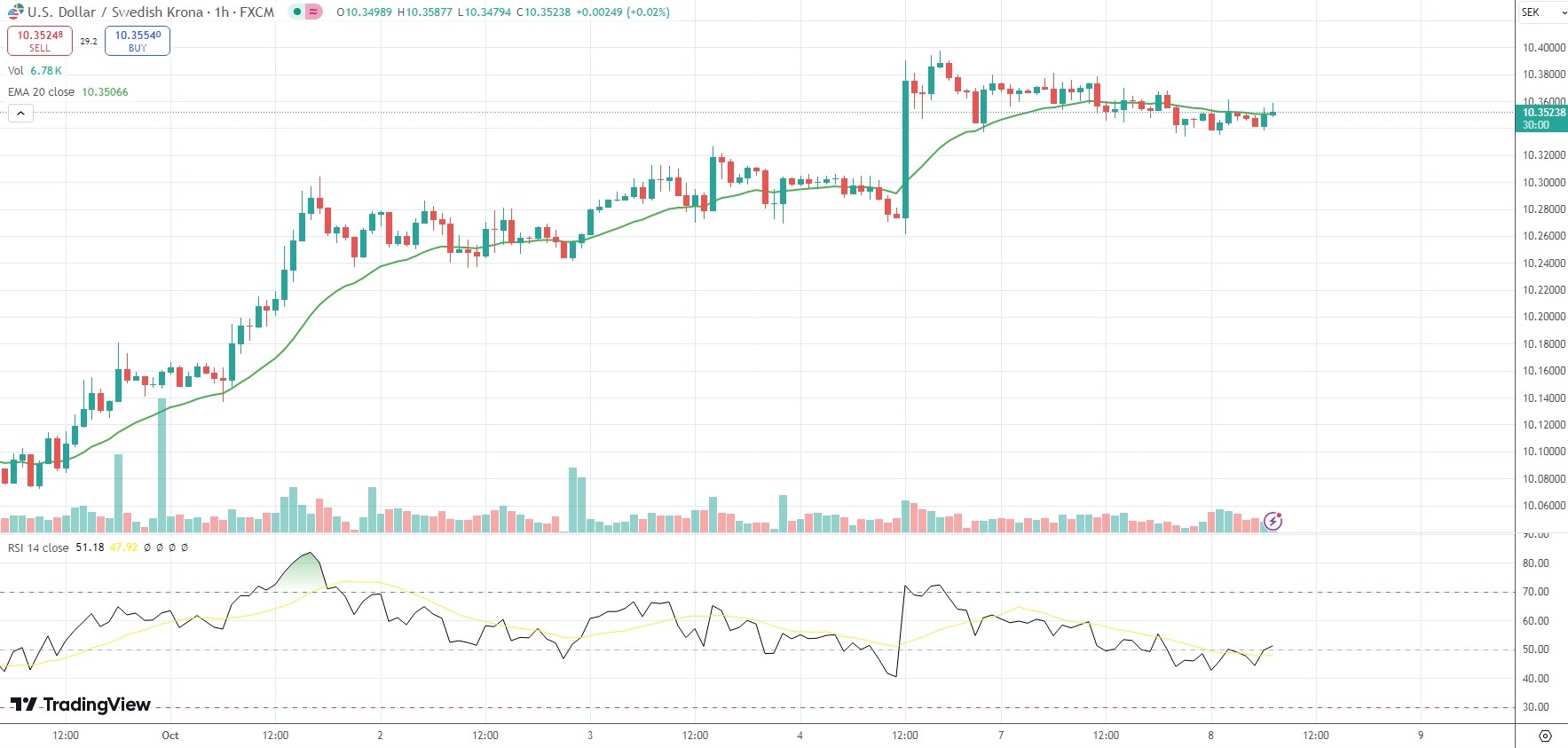 As of 7:29 GMT on Tuesday the USD/SEK currency pair was inching up 0.08% to trade at 10.3508.