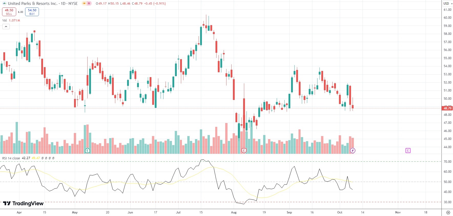 The shares of United Parks & Resorts Inc (PRKS) closed 0.91% ($0.45) lower at $48.79 in New York on Tuesday, as they extended the loss from the previous market session.