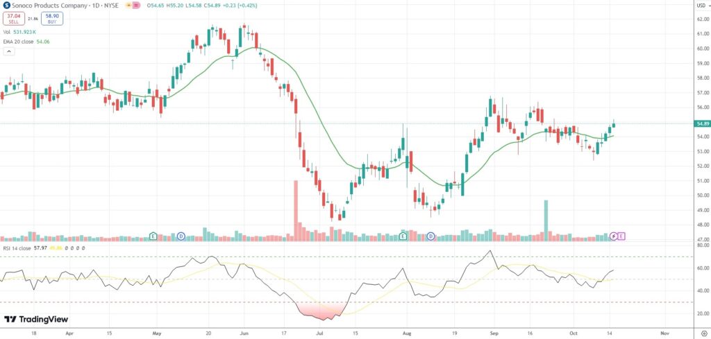 The shares of Sonoco Products Co (SON) closed 0.42% ($0.23) higher at $54.89 in New York on Tuesday, as they extended the gains from the previous two market sessions.