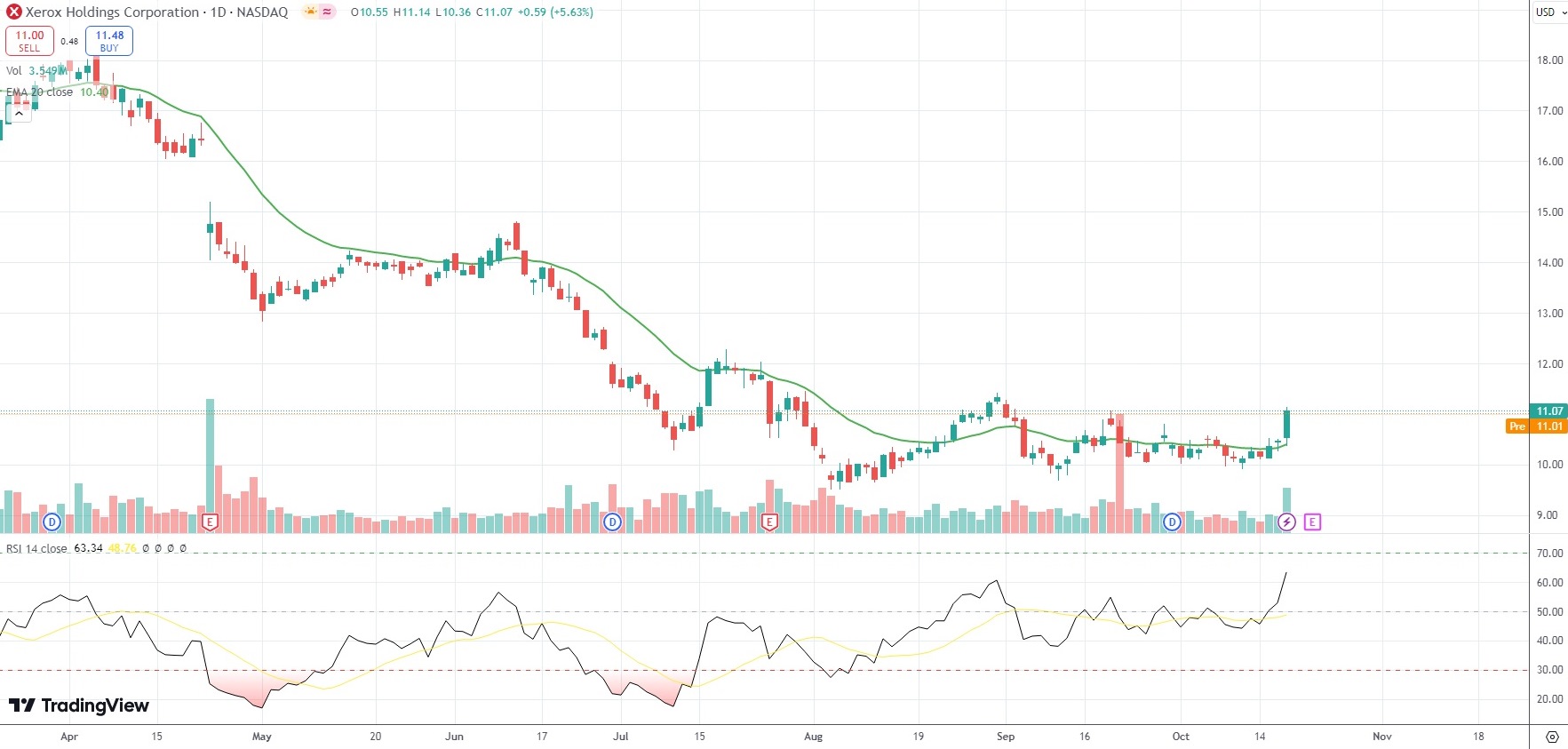 The shares of Xerox Holdings Corporation (XRX) closed 5.63% ($0.59) higher at $11.07 on Nasdaq on Thursday, as they extended the gains from the previous two market sessions.