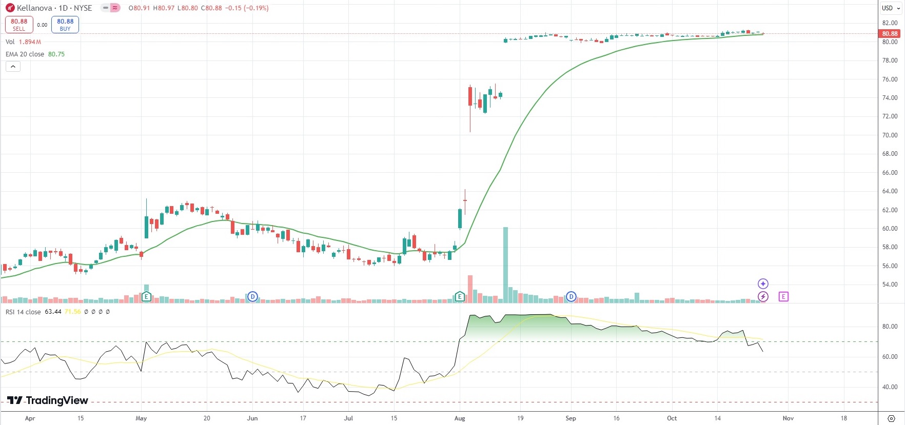 The shares of Kellanova (K) closed 0.19% ($0.15) lower at $80.88 in New York on Friday, as they snapped a two-day streak of gains.