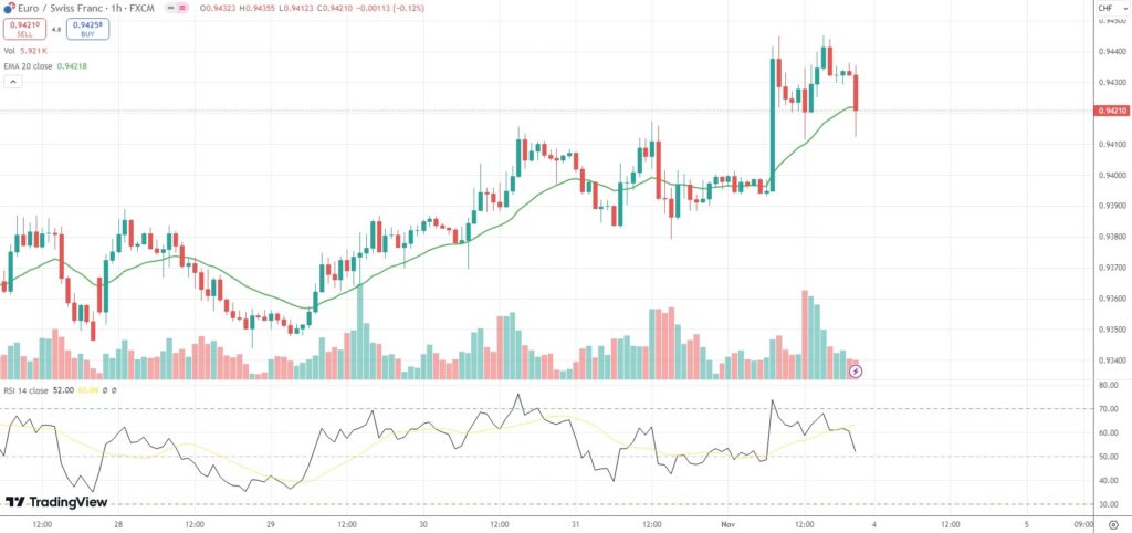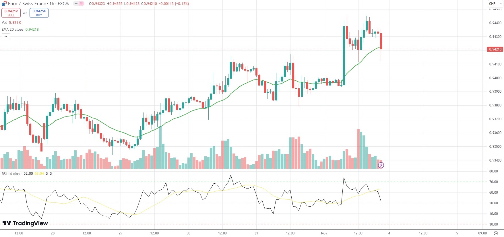 The EUR/CHF currency pair settled 0.31% higher at 0.9421 on Friday. For the week, the minor currency pair went up 0.80%.