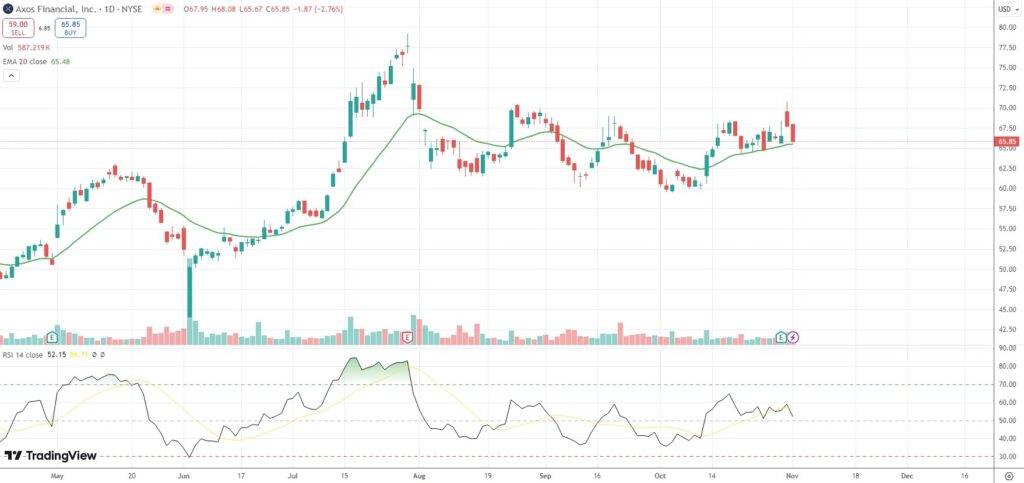 The shares of Axos Financial Inc (AX) closed 2.76% ($1.87) lower at $65.85 in New York on Friday, as they snapped a two-day streak of gains.
