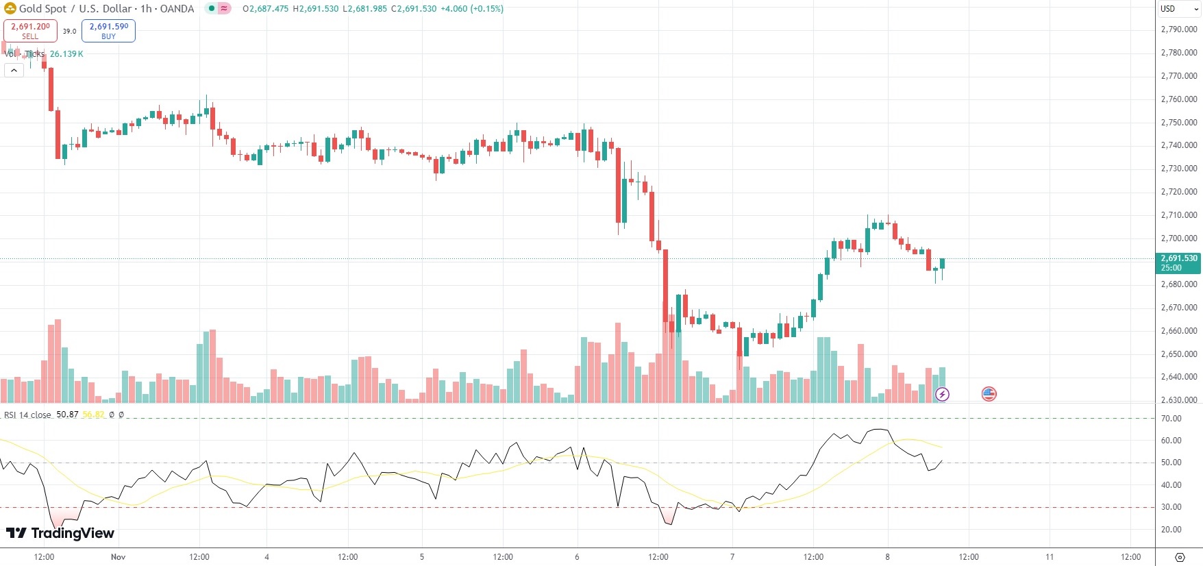 As of 8:34 GMT on Friday Spot Gold was losing 0.57% to trade at $2,691.16 per troy ounce.