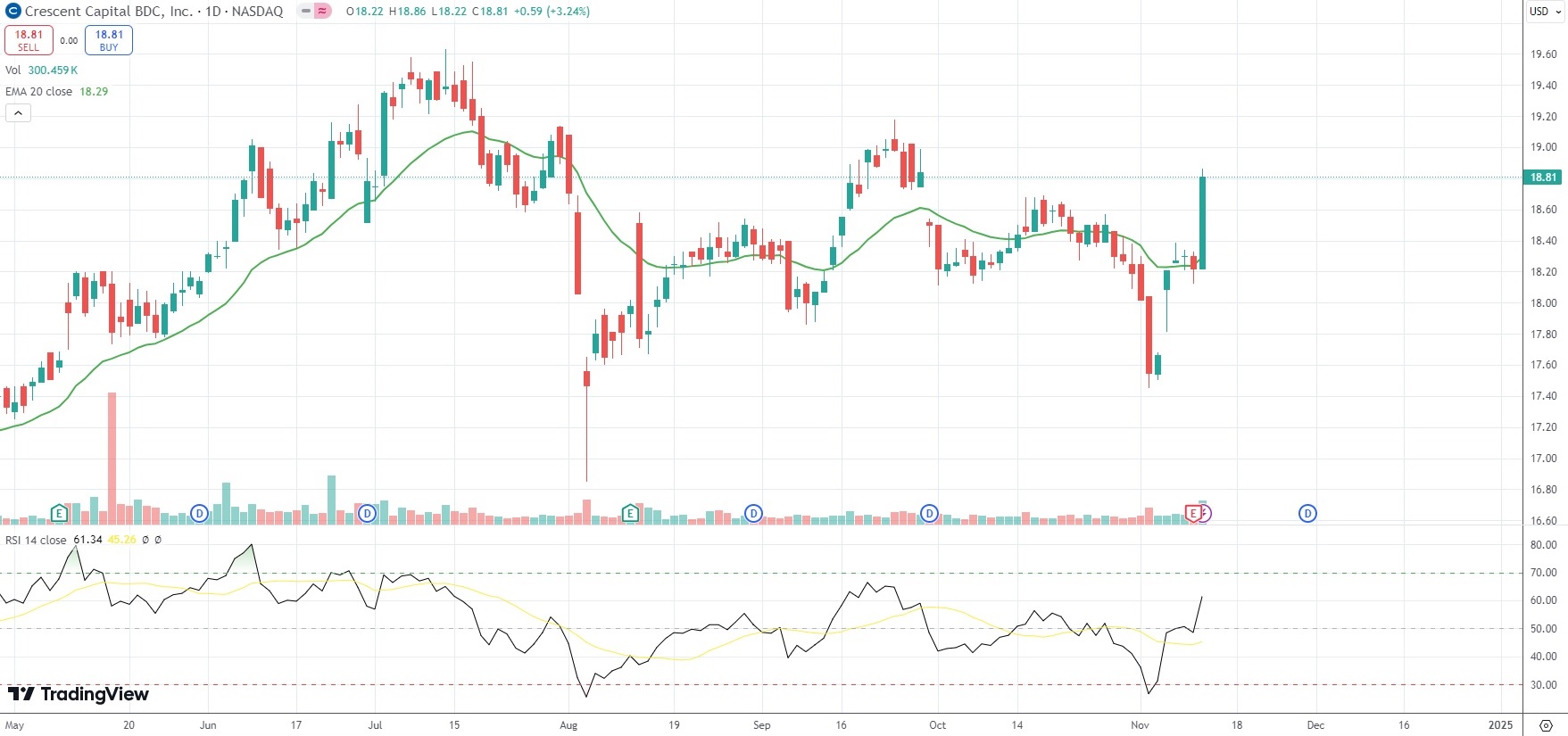 The shares of Crescent Capital BDC Inc (CCAP) closed 3.24% ($0.59) higher at $18.81 on Nasdaq on Tuesday, as they reversed a loss from the previous market session.