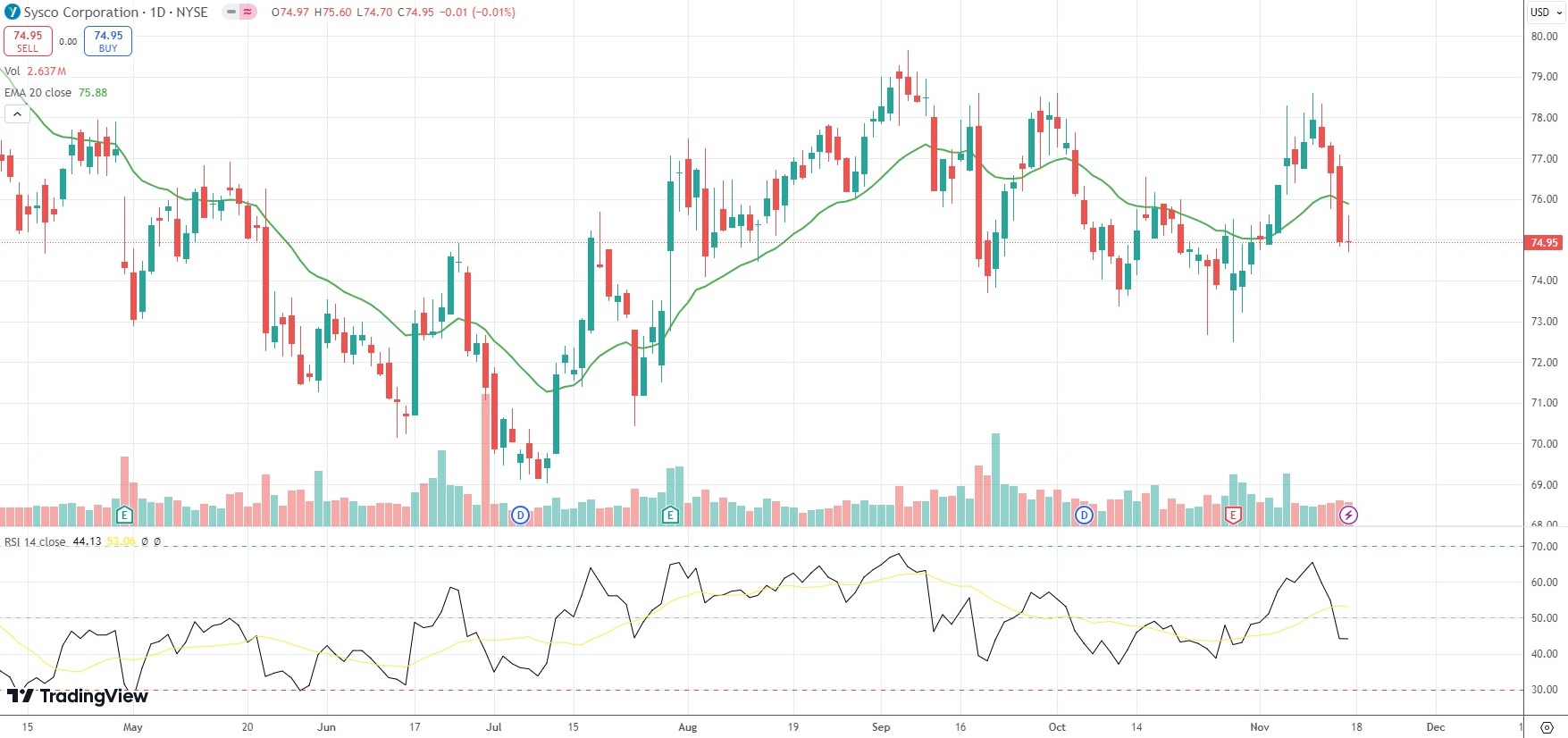 The shares of Sysco Corp (SYY) closed 0.01% ($0.01) lower at $74.95 in New York on Friday.